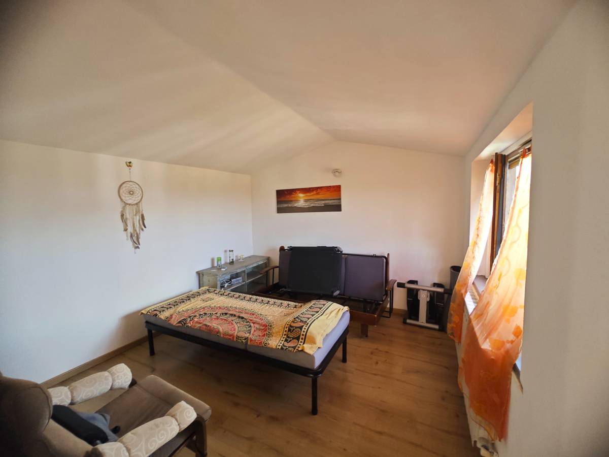 From the living room, a spiral staircase leads to the upper floor (attic), where a versatile space has been created, perfect as a walk-in closet, study, or relaxation area.